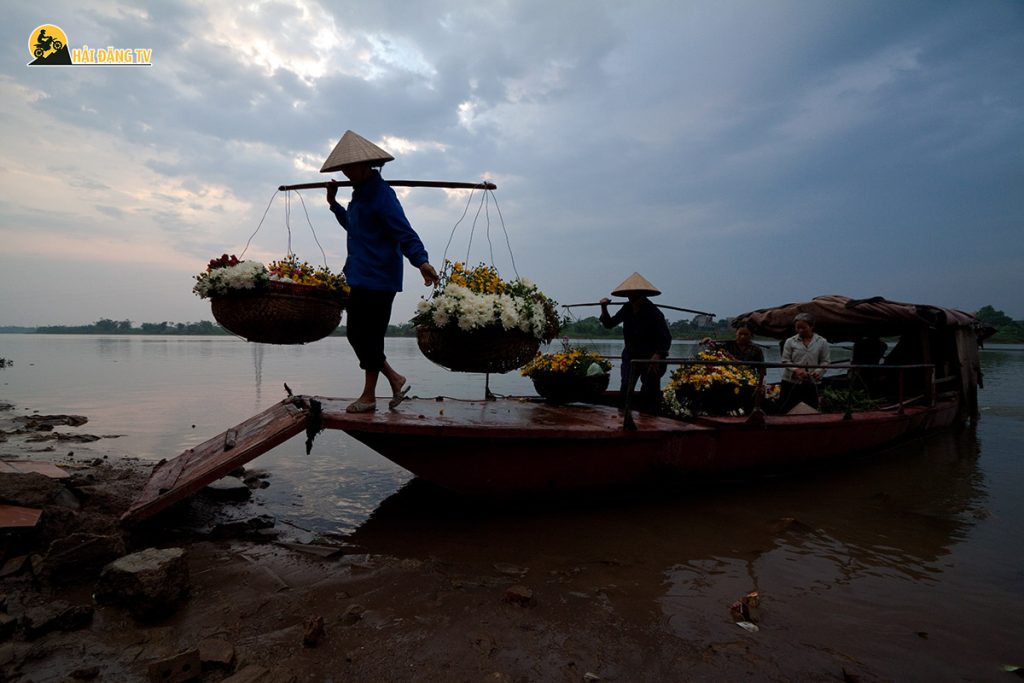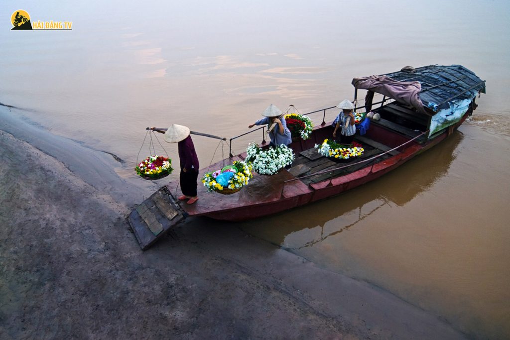 Khi trời còn mờ sương, không gian tĩnh lặng được khuấy động bởi tiếng máy đò nổ giòn tan, tiếng mái chèo khua nước và tiếng người gọi nhau í ới. Từ bên kia sông, những chiếc đò nhỏ từ từ tiến vào bờ, chở theo lấp loáng ánh đèn pin và những gánh hoa đủ màu sắc.