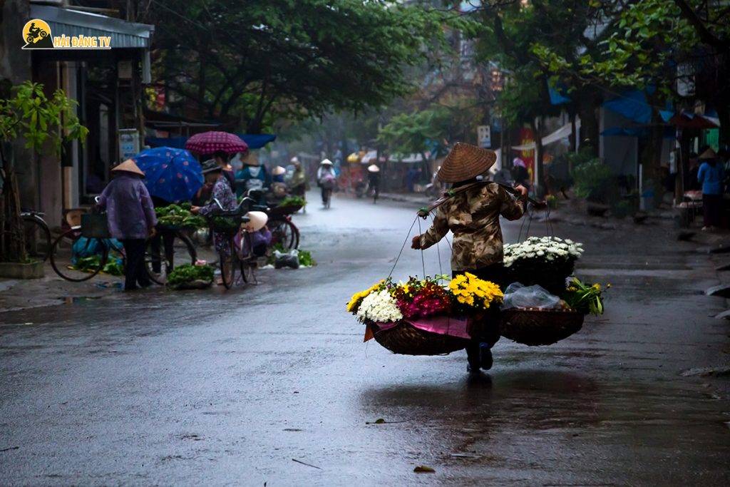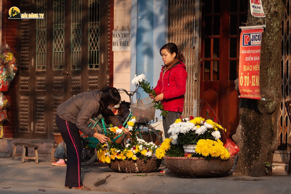 Họ nhẹ nhàng đặt gánh hoa xuống đất, sắp xếp lại từng bó một cách khéo léo. Không có sạp hàng, không có biển hiệu, “gian hàng” của họ chính là đôi quang gánh và khoảng đất nhỏ xung quanh. Người mua và người bán cứ thế quây quần, tạo nên một khung cảnh gần gũi, thân thương.
