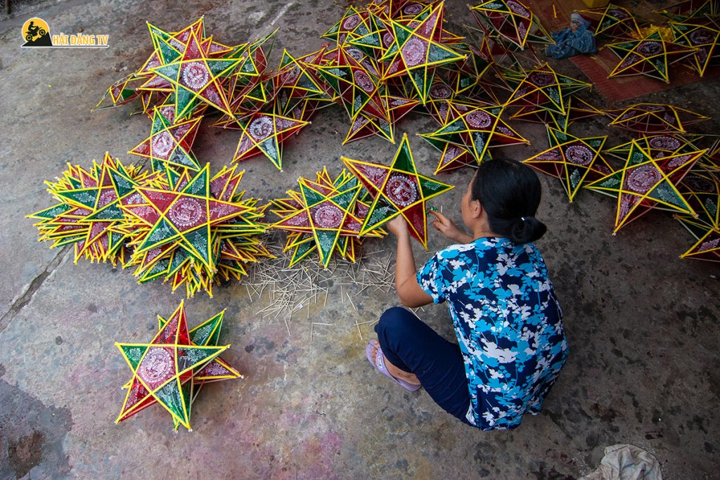 Dán giấy và trang trí: Đây là công đoạn đòi hỏi sự tỉ mỉ nhất. Người thợ dùng hồ dán tự nấu từ bột sắn để phết lên khung rồi dán giấy bóng kính. Giấy phải được dán căng, phẳng, không có nếp nhăn. Sau khi dán xong, đèn sẽ được trang trí thêm bằng các họa tiết, tua rua nhiều màu sắc ở các đỉnh của ngôi sao.