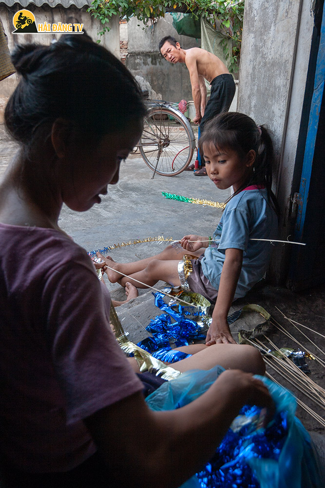 Sân nhà, hiên nhà, thậm chí cả những khoảng đất trống ven đường đều trở thành “xưởng sản xuất”. Người chẻ nan, người uốn khung, người dán giấy bóng kính, người trang trí… Mỗi người một công đoạn, phối hợp nhịp nhàng tạo thành một dây chuyền sản xuất thủ công đầy sống động.