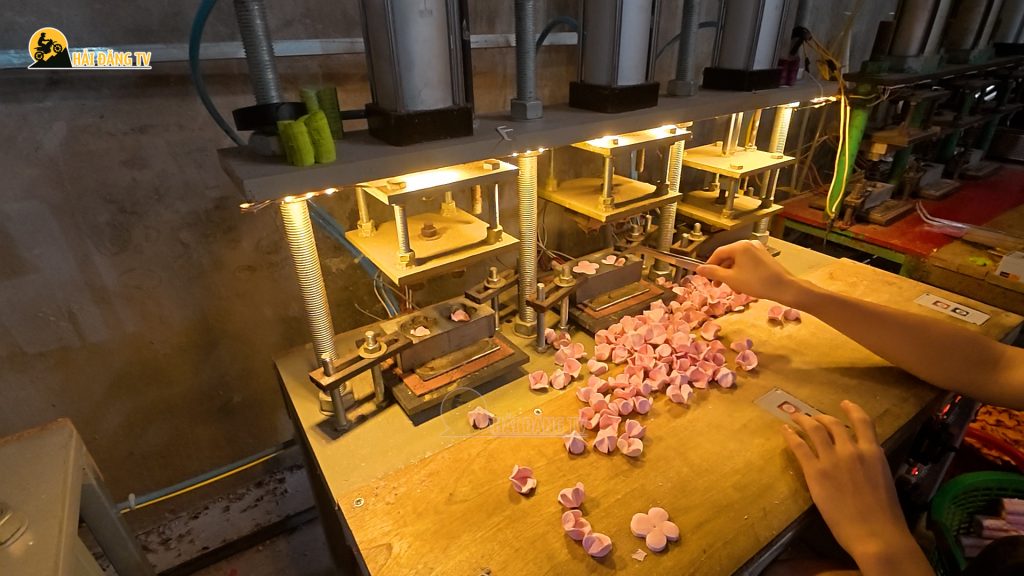 Mỗi công đoạn từ pha màu, nhuộm vải, tạo hình cánh hoa, ghép nụ, làm lá… đều được thực hiện thủ công kết hợp một phần máy móc. Người thợ phải có con mắt nghệ thuật để phối màu sao cho tự nhiên và có đôi tay khéo léo để tạo được cái “hồn” cho từng bông hoa.